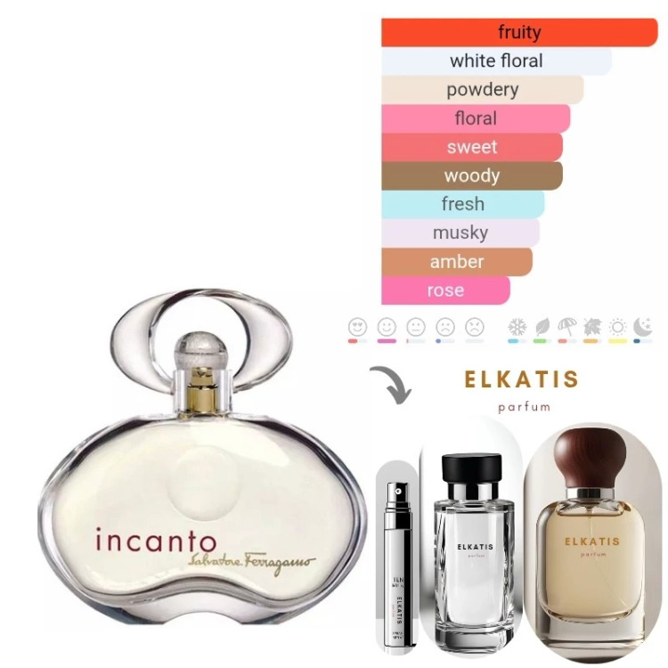 اینکانتو تصویرگر علاقه سالواتوره فراگامو به زیبایی است؛ و بالاتر از همه زیبایی زنانه. اینکانتو بیانی مدرن از افسانه سیندرلاست؛ با همان میزان جادو و انرژی مثبت. نت های بالا شامل پوست هلو، آلو و فلفل جاماییکایی است. سوسن سرخ نیز عمق بیشتری به رایحه عطر می بخشد. همچنین گل یاس تازه، گل صد تومانی و گل ختی با یکدیگر ترکیب شده اند. همچنین مشک سفید، چوب صندل و عنبر در این عطر وجود دارند. بطری عطر به شکل کفش پاشنه بلند است که نمادی از نگاه سالواتوره فراگامو به دنیا میباشد.