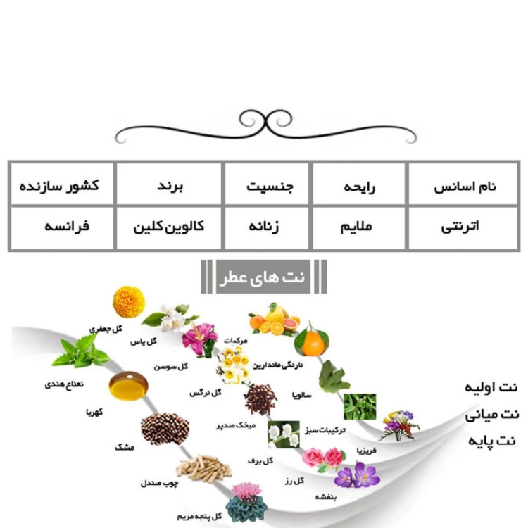 مشتریان عزیز قیمت عطر ها بر اساس یک میل محاسبه شده است مقدار حجم عطر را بر اساس مقدار مورد نیاز خود تغییر دهید . تمامی محصولات تضمین کیفیت و قیمت دارند/به قیمت پخش عرضه میشود.شیشه عطر مورد نظر شما رایگان میباشد . حجم های موجود 💥۱۰میل 💥۱۵میل 💥۲۰میل 💥۲۵ 💥۳۰میل 🔥۳میل عطر رایگان ارسال میگردد🔥 💥۵۰میل 🔥۵میل عطر رایگان ارسال میگردد🔥 💥۶۰میل ۶میل عطر رایگان 💥۷۰میل ۷میل عطر رایگان 💥۱۰۰میل 🔥۱۰میل عطر رایگان ارسال میگردد🔥 اترنیتی یکی دیگر از عطرهای بسیار موفق کالوین کلین است که بهعنوان ادای احترامی به ازدواج آقای کالوین کلین طراحی شده است. اترنیتی همچون نامش (به معنای ابدیت) سرودی تقدیمشده به مهمترین ارزشهای ابدی است: عشق، خانواده و آرامش. آمیزه اترنیتی زنانه با نتهای باطراوت مرکباتی و ترکیبات سبز شروع میشود و پس از آن نت بنفشه و گل برف وارد صحنه میشوند. نت میخک صدپر هم با سویه ادویهایاش آکوردی فلفلی به روح گلفام نتهای میانی میبخشد. نتهای پایه نیز لطیف هستند و از بافت پودری گل آفتابپرست در کنار نت چوب صندل صورتی و نت شفاف مشک سرشته شدهاند. نوع عطر خالص برند کالوین کلین عطار صوفی گروجیسمن طبع معتدل سال عرضه 1988 گروه بویایی رایحه های گلی کشور مبدأ ایالات متحده مناسب برای بانوان اسانس اولیه نارنگی ماندارین، فریزیا ، ترکیبات سبز ، سالویا ، مرکبات اسانس میانی رز ، بنفشه ، میخک صدپر ، یاس، گل برف ، نرگس ، گل سوسن، گل جعفری اسانس پایه مشک ، کهربا، نعناع هندی ، چوب صندل سفید ، گل پنجه مریم