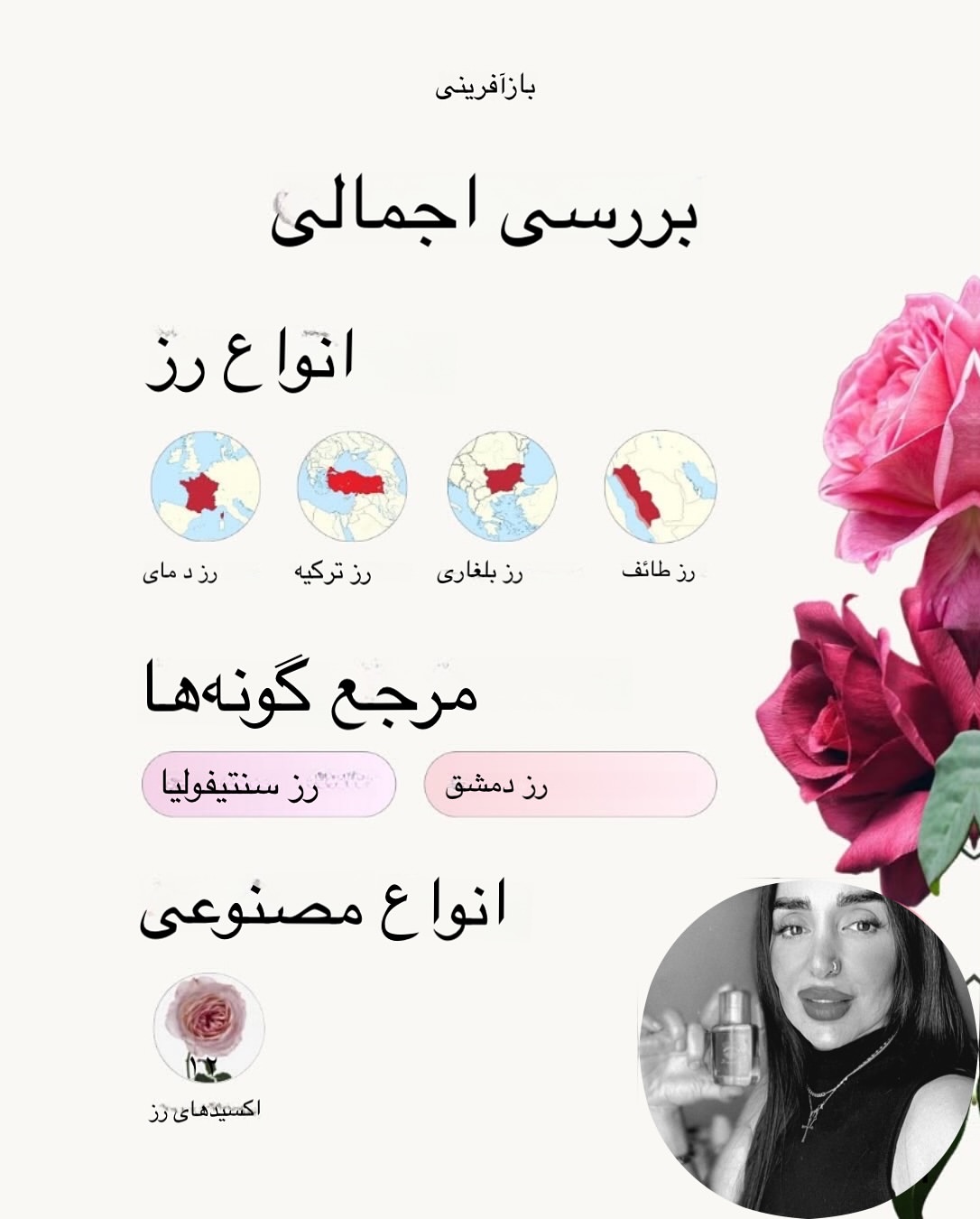… «رزها فقط زیبا نیستند… دنیایی از تنوع، تاریخ و رایحه در دل خود دارند. امروز بیش از ۳۰۰ گونه رز در جهان شناخته شده و هزاران نوع هیبریدی از آنها پرورش داده شده است. هر نوع رز، رایحه، دوام و کاربرد خاص خودش را دارد Damask Rose (رز دمشقی): با عطری عمیق و گلی، رایجترین رز در صنعت عطرسازی لوکس. Centifolia Rose (رز صدبرگ): رایحهای شیرین و لطیف با ماندگاری بالا؛ معروف به “رز فرانسوی”. Tea Rose (رز چای): ظریف و مدرن با نتهای سبک و تازه. Wild Rose (رز وحشی): طبیعی، نادر و بسیار ماندگار در نتهای پایهی عطر. هر رز، امضای خاص خودش را روی پوست میگذارد تو کدوم نوع رز رو بیشتر دوست داری؟ برام بنویس… برای انتخاب رز مناسب شخصیتت، بده . . بنظرت شما کدومش خوبتره؟!